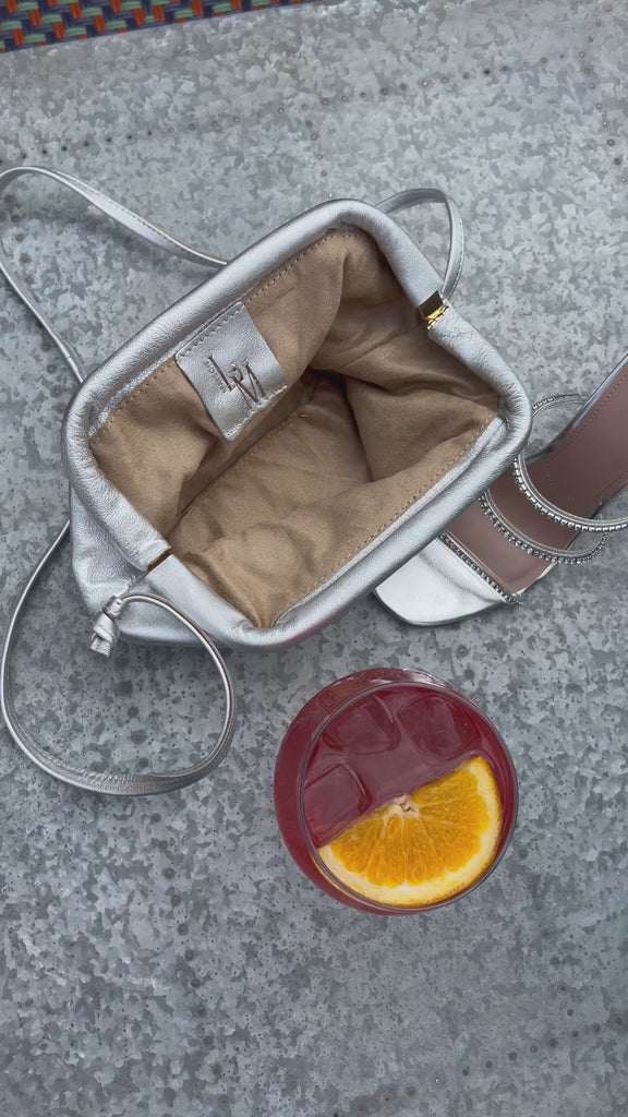 Sac LOU argenté en cuir souple légèrement froissé avec bandoulière amovible et réglable permet de le porter à la main ou en bandoulière, offrant un style modulable et raffiné, idéal pour accompagner aussi bien une journée citadine qu'une soirée estivale.
